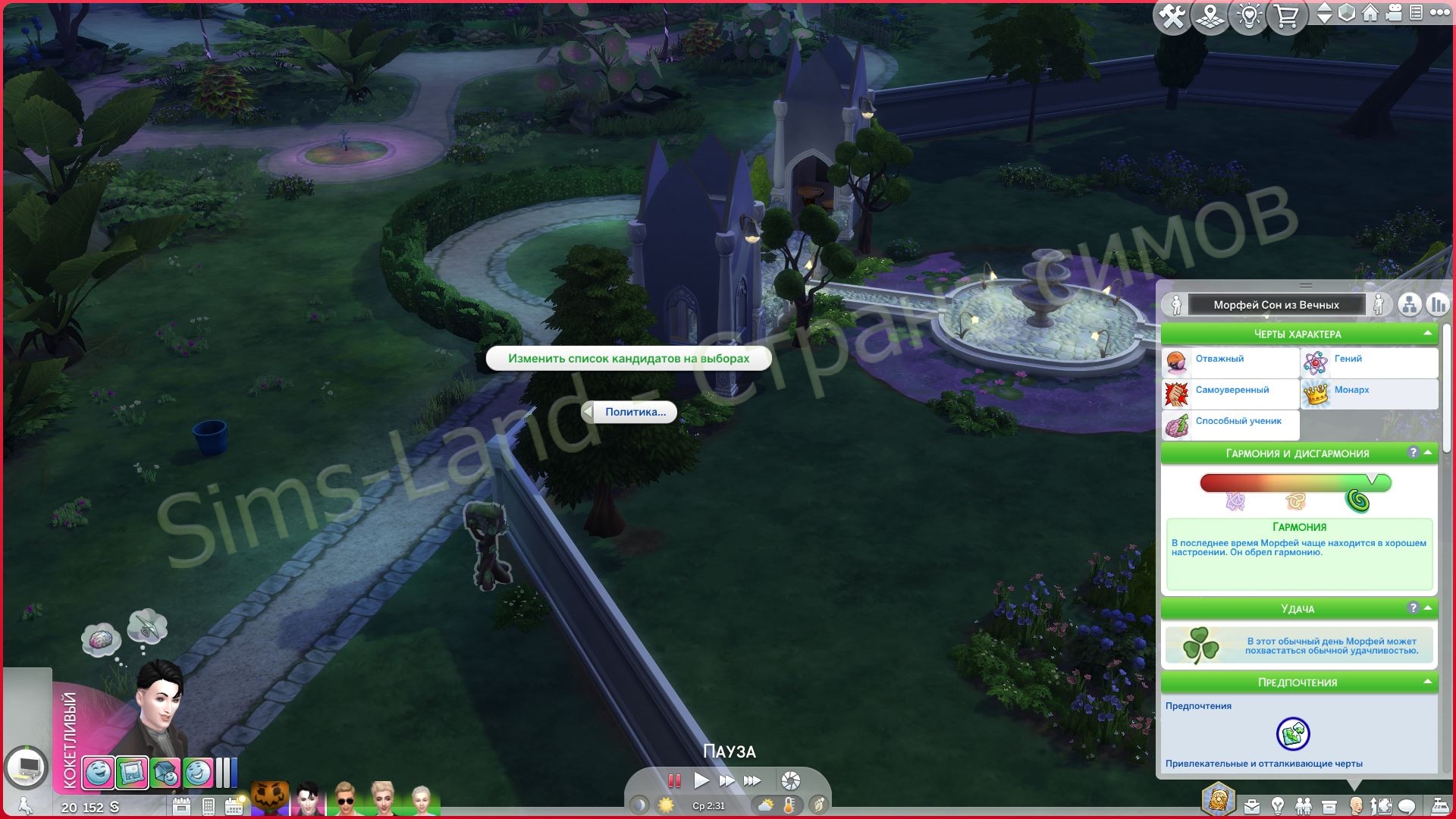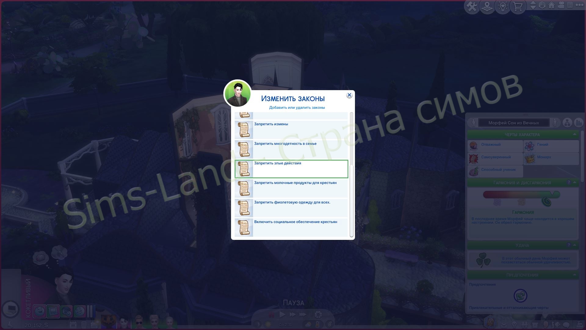 Этот древний мод знаком многим заядлым симмерам. Он имеет огромное количество дополнений, возможностей, черт характера, объектов строительства и CAS, ЖЦ, взаимодействий и много другого. Но главное – он позволяет отыграть королевство. Самое настоящее королевство с королями, дворянством, слугами, тюрьмой, балами и пр.