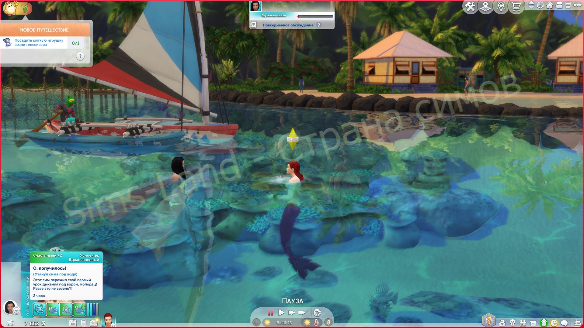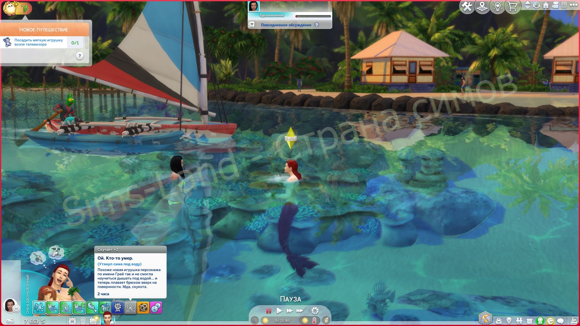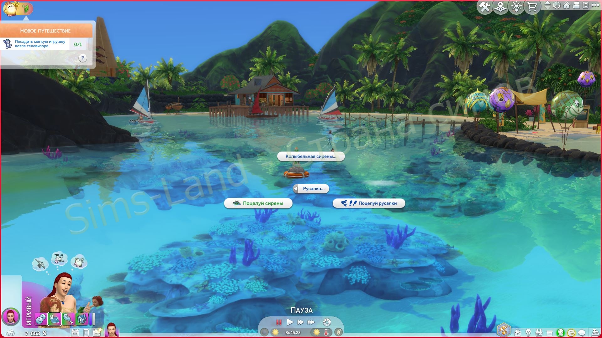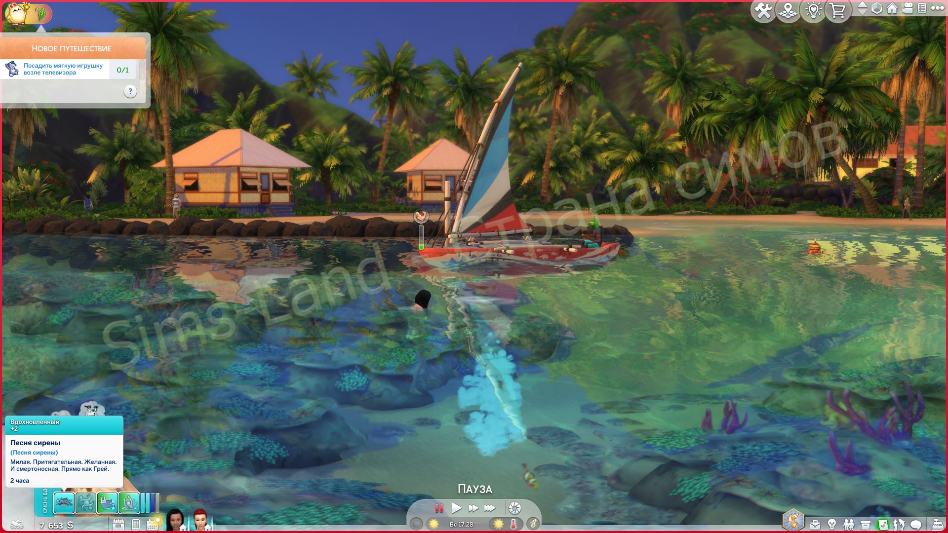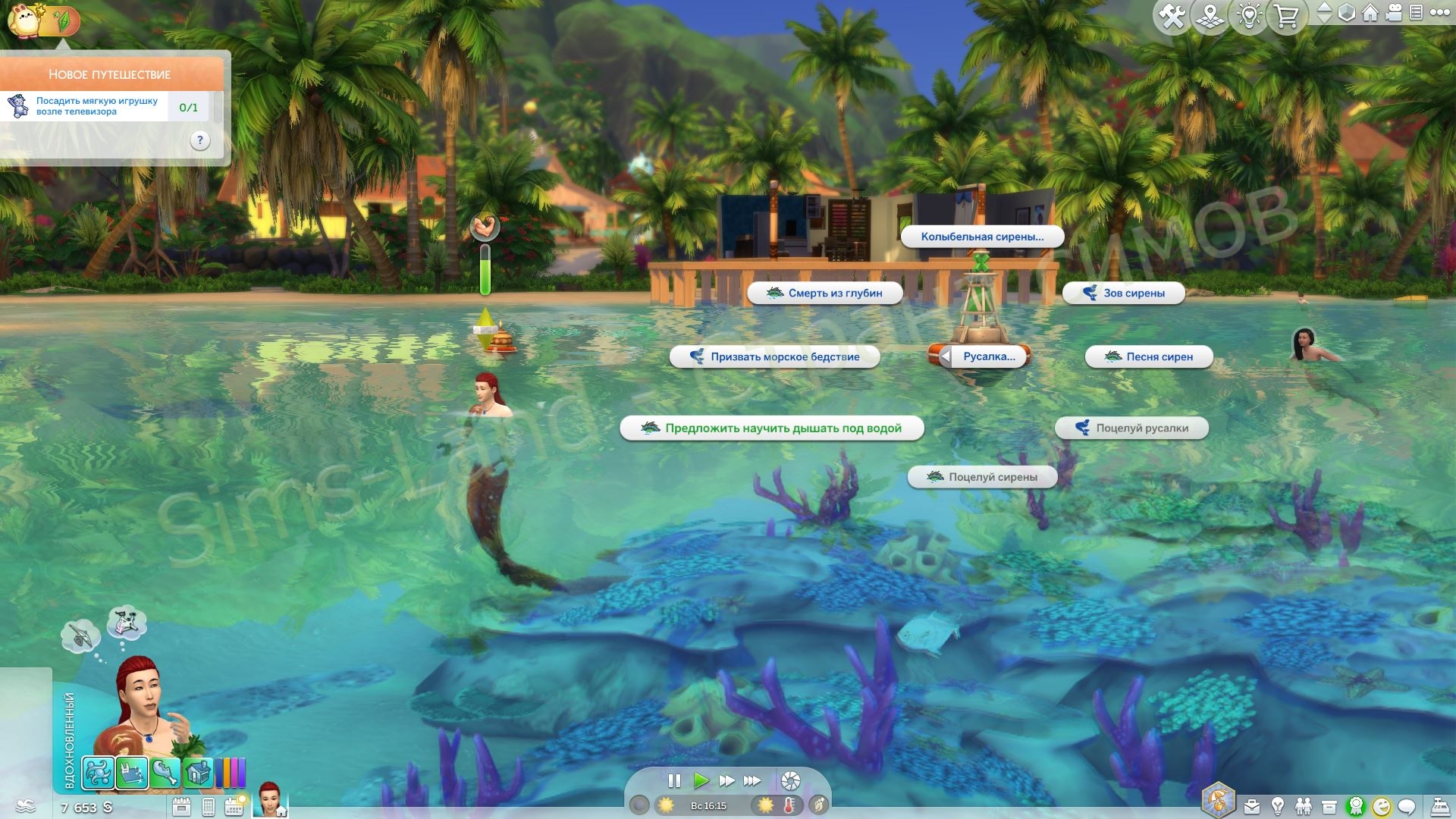 - Песня сирены: русалка поет, чтобы заманить сима, а затем затягивает его под воду, чтобы утопить.