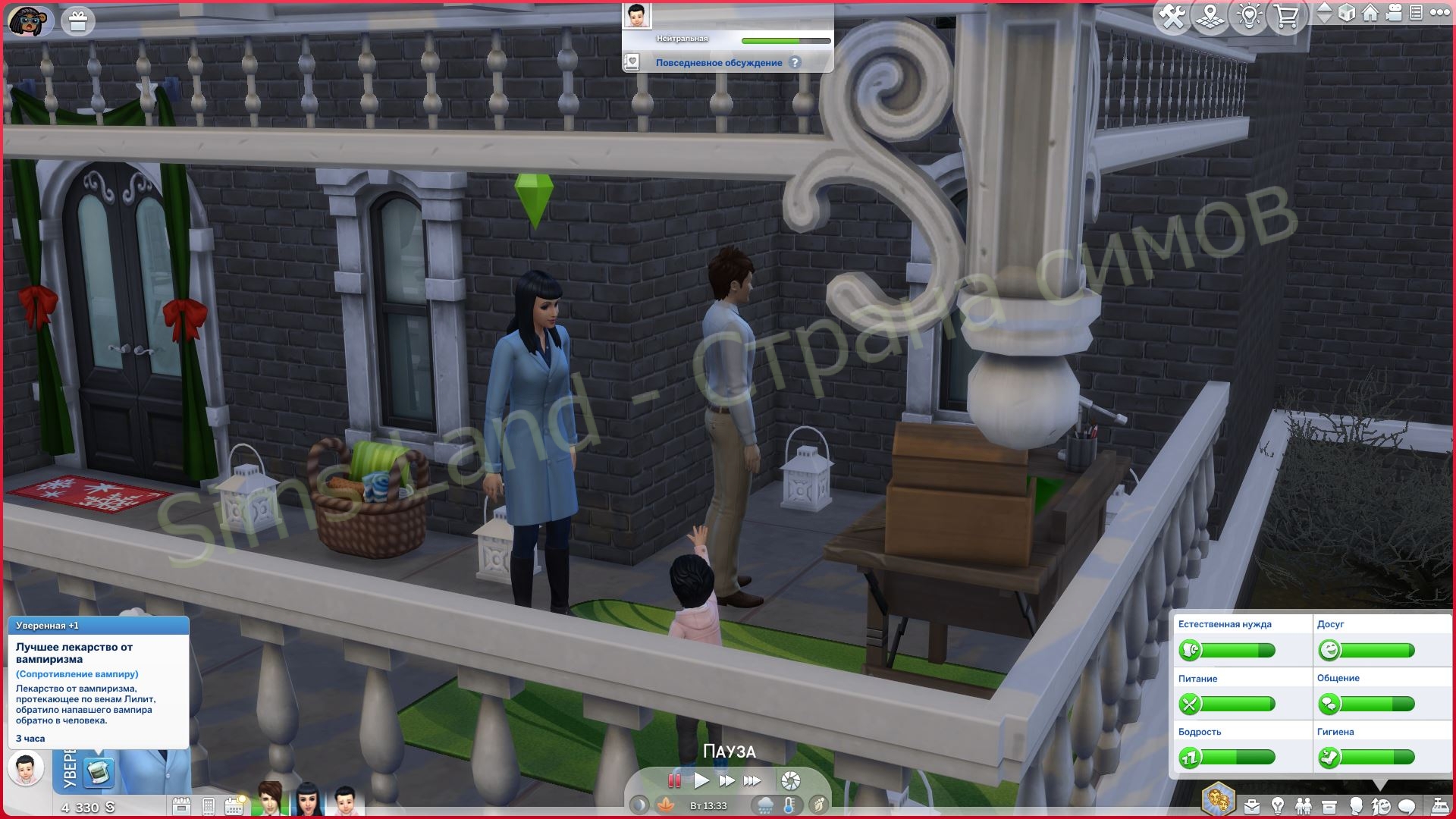 - С этим модом, если вы играете за вампира, нужно быть осторожным, ведь нельзя узнать, есть ли у сима лекарство от вампиризма в крови, если он не признался вам.