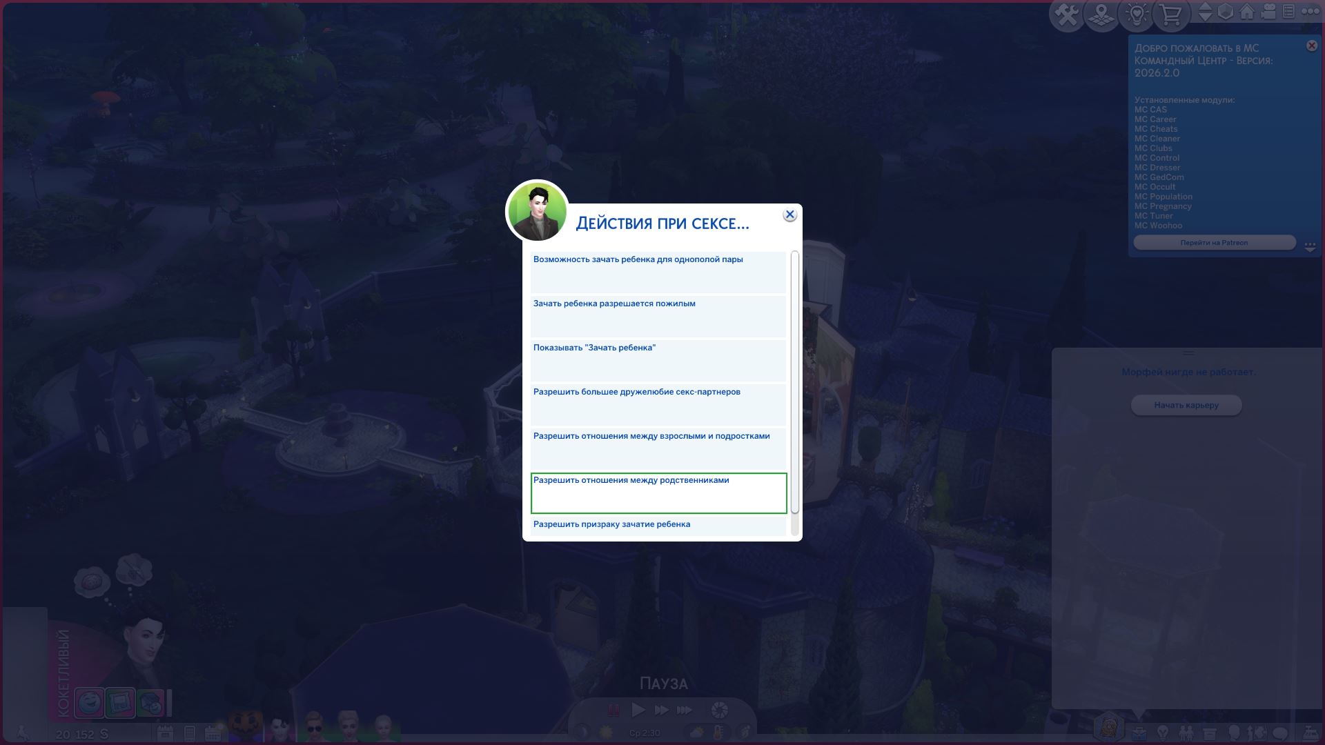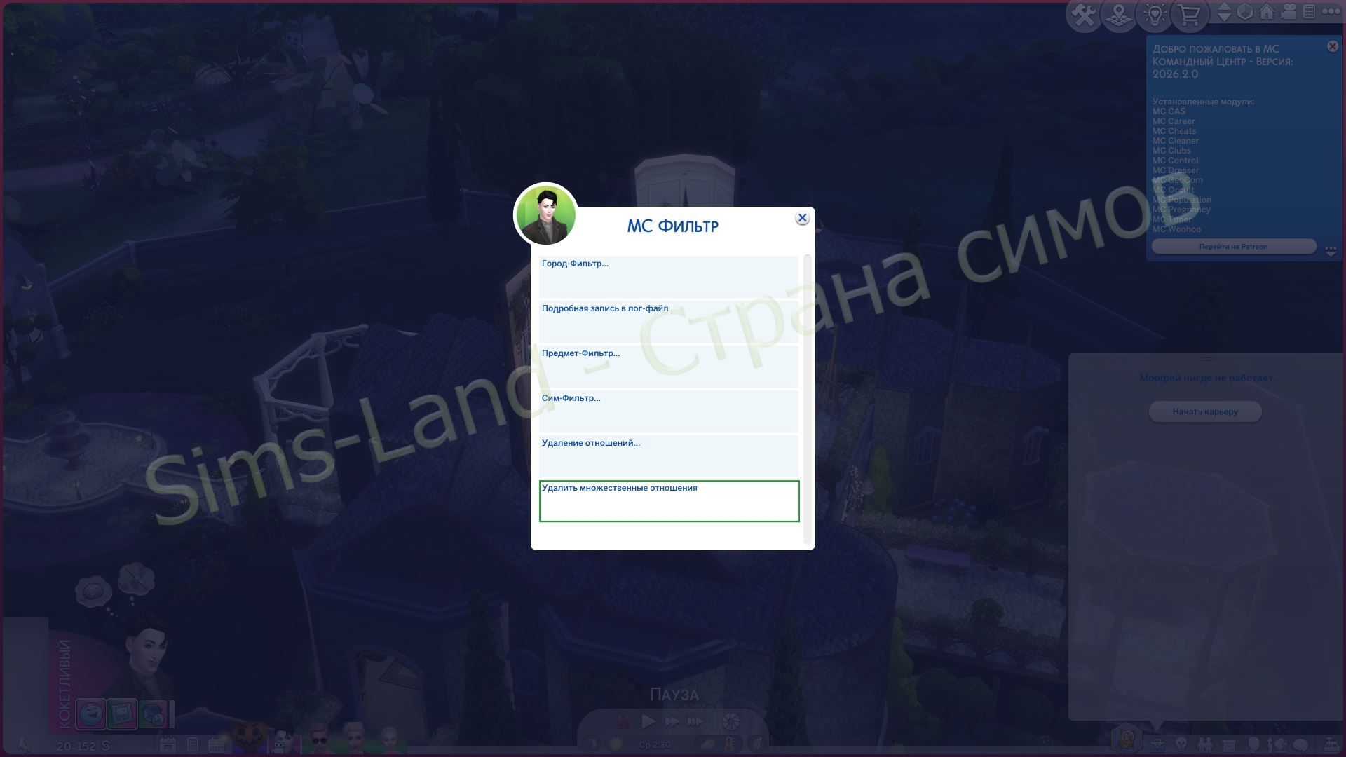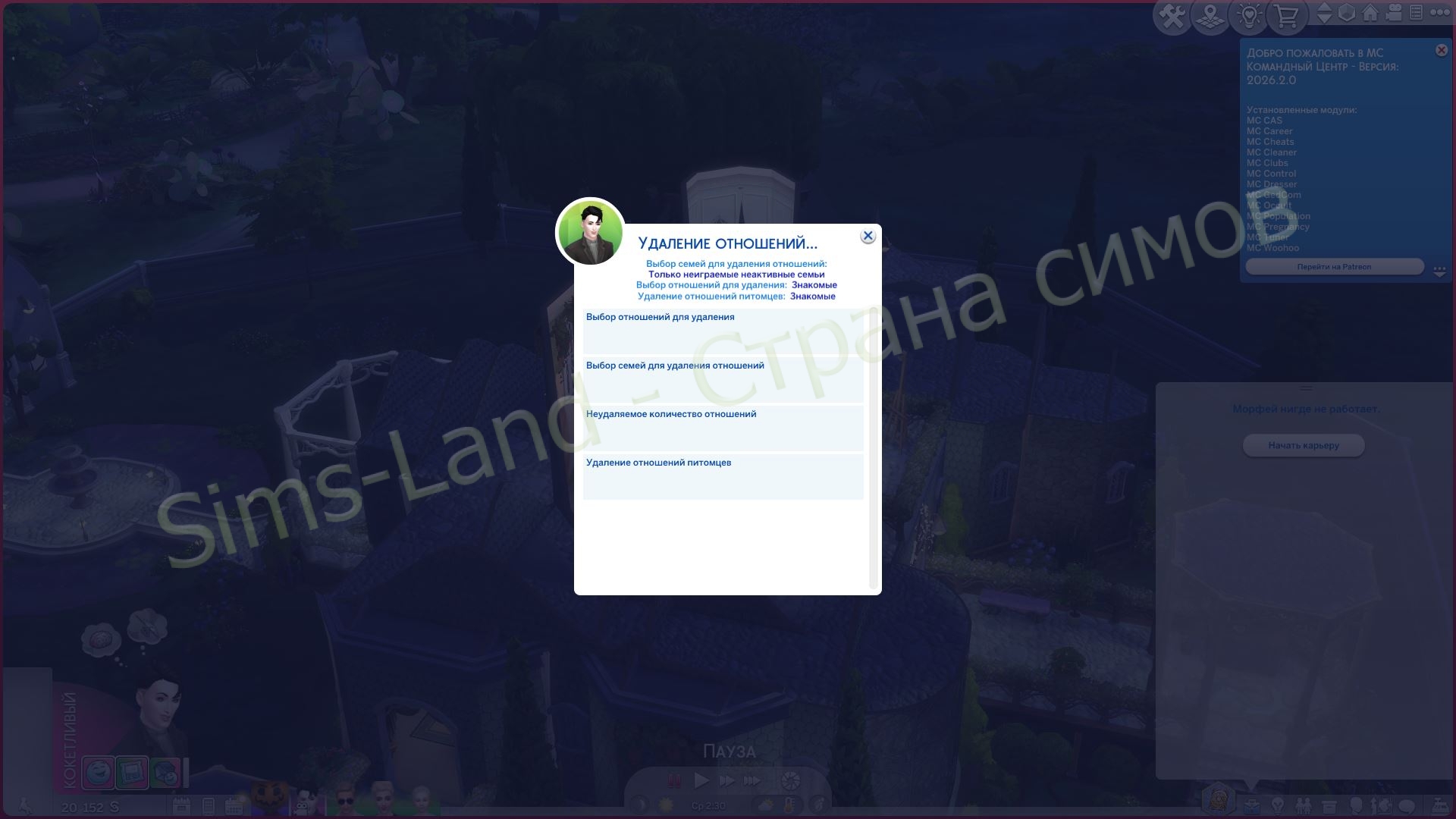 Итак, в MC Фильтр Добавлен код для удаления, что если Симы родственники, но и супруги, то отношения супруги очищаются, чтобы семейные отношения сохранялись, и диалог всё равно работал.