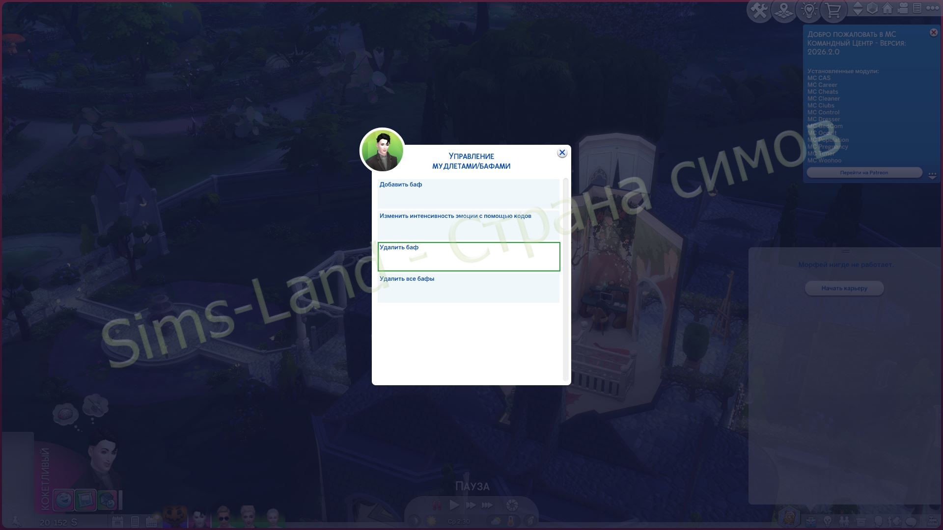 Исправлена функция для симов MC-Читы > Чит-код для информации о симе > Управление мудлетами/баффами > Удалить баф, которая не давала результатов для поискового текста, как ожидалось (Добавить баф тоже не работал).
