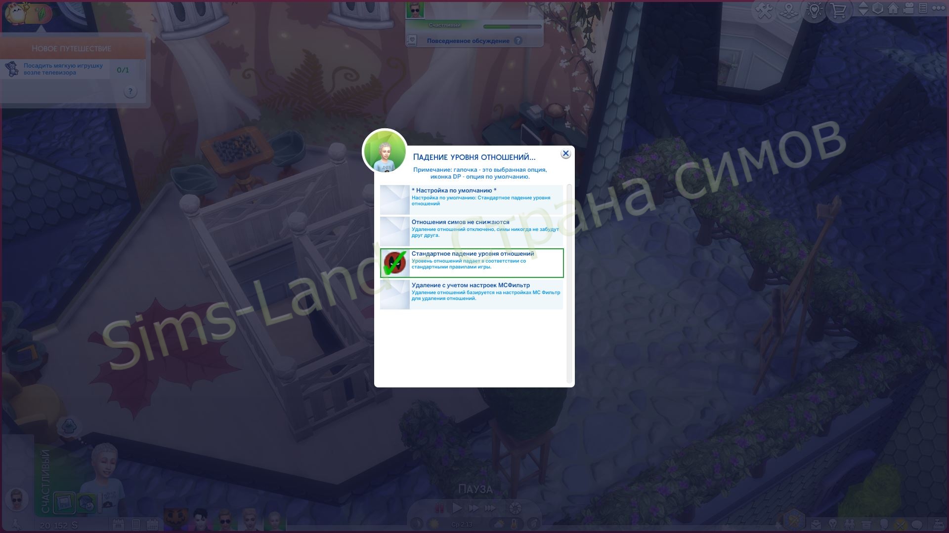 Автор рекомендует использовать мод типа MC Command Center Командный центр (доступен на нашем сайте), чтобы полностью отключить падение уровня отношений (Настройки MCCC -> Настройки отношений -> Падение уровня отношений -> Отношения не снижаются).