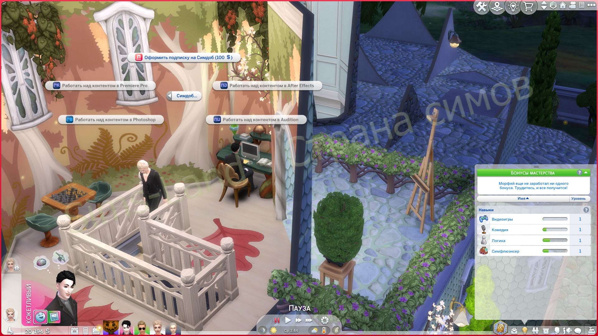 Ваш сим сможет поработать над своим контентом в Симдоб (дублированный Adobe). Взнос составляет §100. После оплаты откроется доступ к: Photoshop, Audition, Premiere Pro, After Effects.