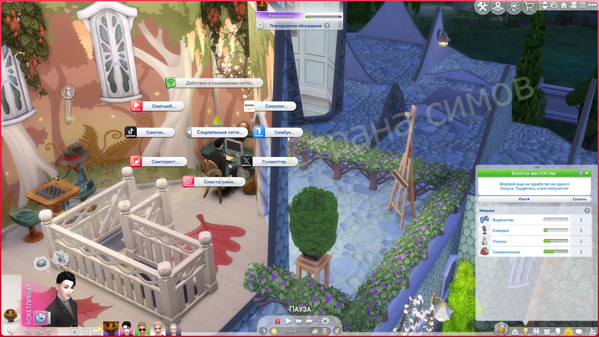 Сим сможет создать аккаунт (Симток, Симтьюб, Симазон, Симбук, Симстаграмм, Симтерест и Симвиттер), затем он получит доступ к взаимодействиям в социальных сетях (которые довольно простые, но… для повествования). Симы развивают навык при различных взаимодействиях в социальных сетях.