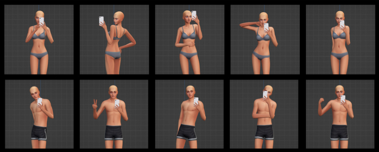 Автор сделал 25 поз для женских симов и 25 поз для мужских симов. Если хотите использовать имеющиеся позы с Pose Player, автор добавил дополнительное действие в меню отладки Зеркала под названием Добавить телефон.