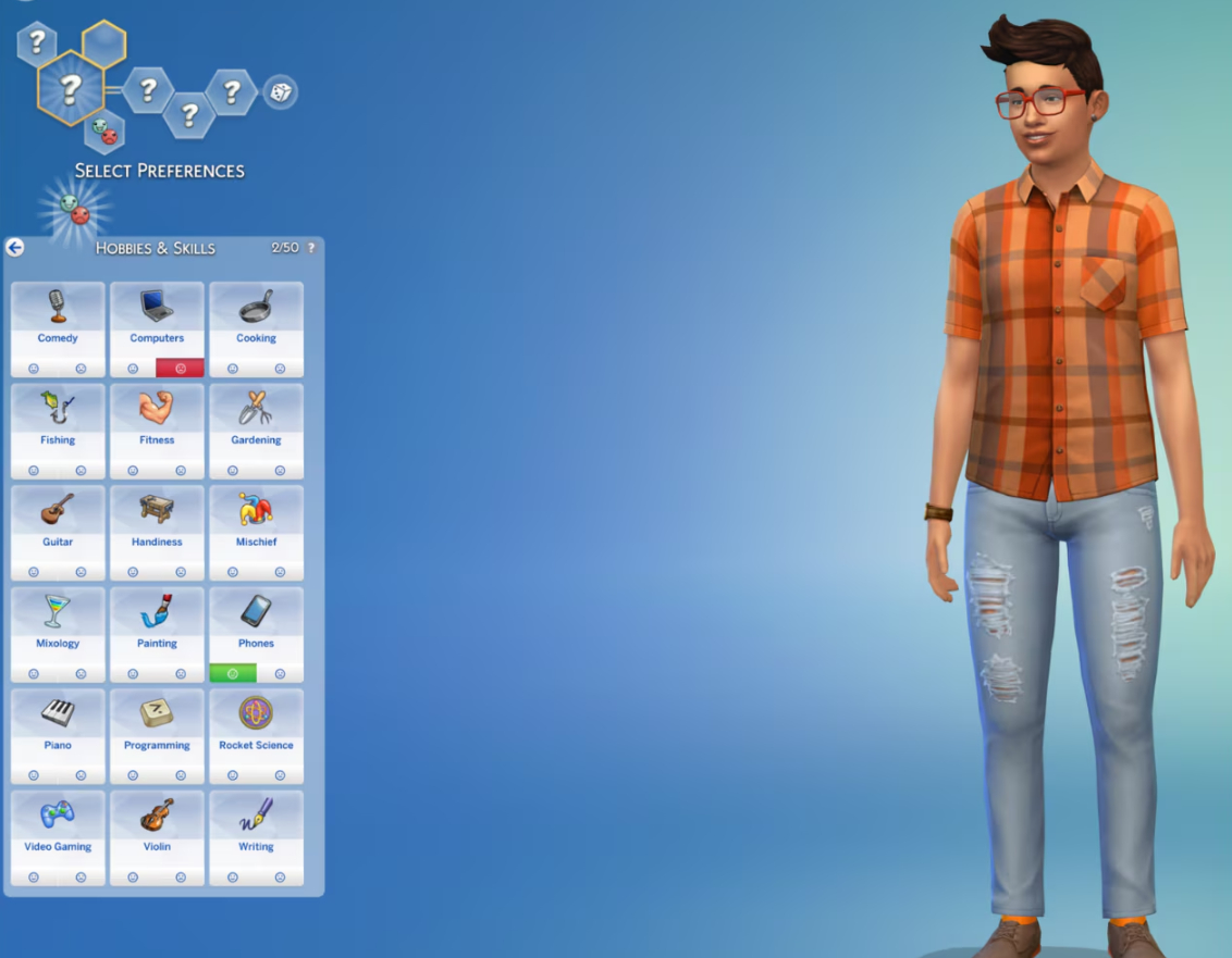 Экран редактора создания персонажа с юным персонажем в оранжевой клетчатой рубашке и рваных джинсах. Слева — сетка предпочтений для увлечений и навыков.