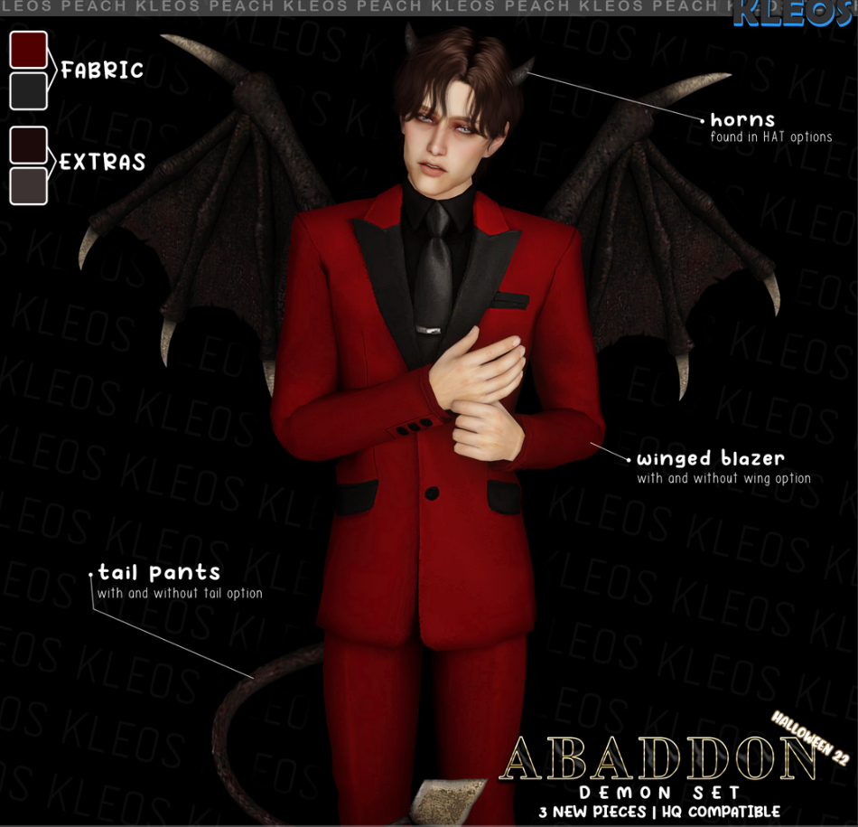 Придерживаясь дьявольской темы, Kleos создал полный набор для создания полноценного демонического образа. В этом наборе Sims 4 cc вы получите блейзер (с острыми черными крыльями или без), брюки (с демоническим хвостом или без) и черные рога. Мы полностью загипнотизированы этим элегантным нарядом.