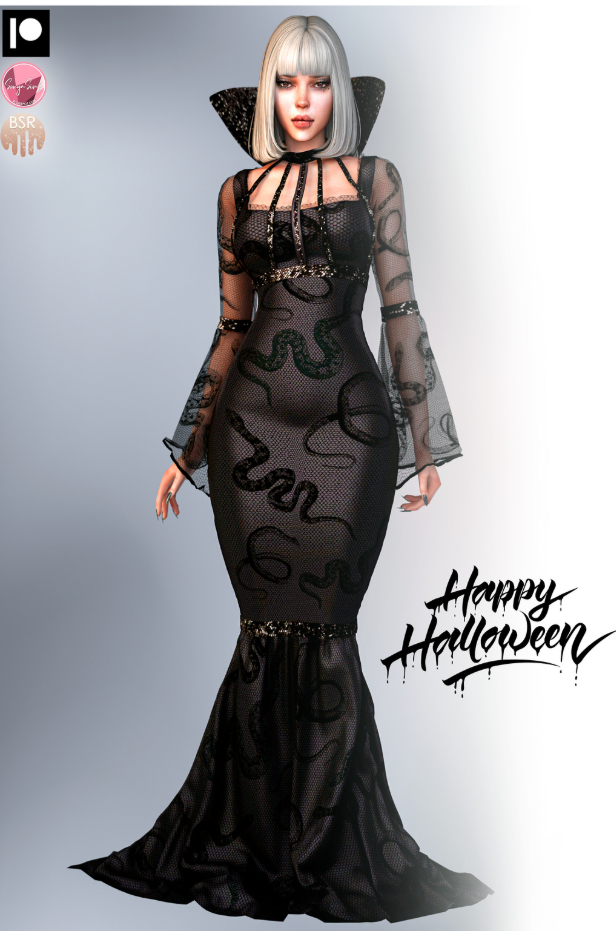 Чтобы создать роскошный образ на Хэллоуин, это платье в 25 разных цветах станет настоящим сюрпризом! Благодаря шелковой текстуре, уникальным рукавам и элегантным змеям ваш сим будет привлекать к себе внимание, как гламурная химера.