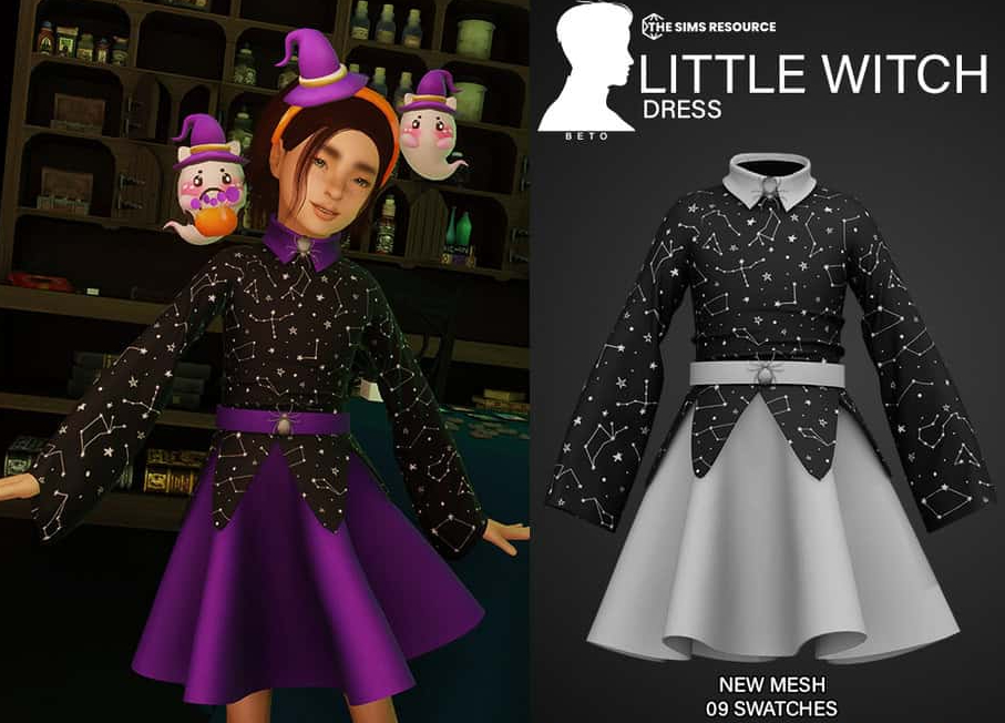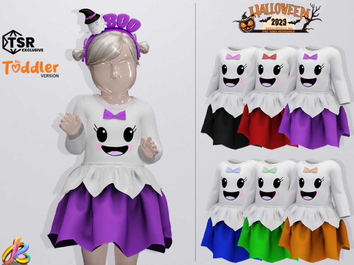 Если вы хотите, чтобы ваш малыш полностью погрузился в атмосферу Хэллоуина, этот наряд вам по вкусу! В комплекте идет ободок на голову, на которой буквально написано «бу», и очаровательное платье в тон. Этот наряд для Sims 4 Halloween CC скорее милый, чем страшный.