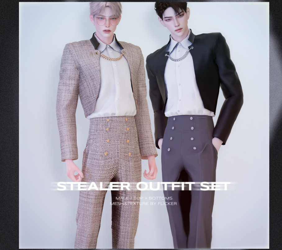 Комплект нарядов Stealer — это смелый ансамбль высокой моды, который источает изысканность с современными нотками. Этот мужской костюм Sims 4 имеет укороченный блейзер со структурированными плечами и строгим кроем в сочетании с брюками с высокой талией и двойными пуговицами, которые удлиняют силуэт вашего персонажа. Вы найдете костюм в 12 смелых оттенках, варьирующихся от гладкого монохромного до фактурного твида.
