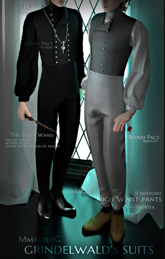 «Костюм Грин-де-Вальда» — это крутой мужской костюм Male Suit CC в винтажном стиле для The Sims 4, который улучшит стиль гардероба вашего сима. Его верх украшен двубортным жилетом с высоким воротником и богато украшенными золотыми пуговицами, которые придают структурированный, но изысканный стиль. Костюм имеет пышные рукава с узкими манжетами для дополнительного штриха царственной изысканности. Костюм представлен в 10 ярких оттенках, включая черный и белый. Низ состоит из подходящих брюк с высокой талией и строгого приталенного кроя, который удлиняет ноги вашего сима. Он представлен в 9 образцах и может быть найден в категории брюк.