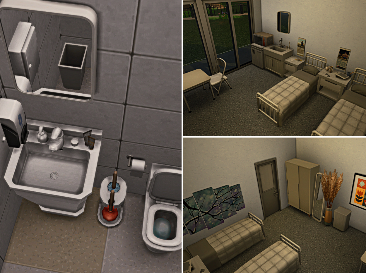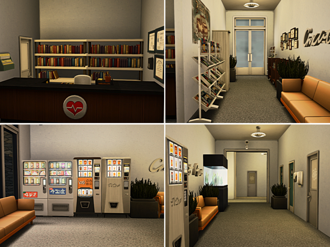 Больница имеет 2 этажа и включает в себя: стационар (с койками) на 6 персонажей, 4 палаты 2х2 и 2х1, комнату отдыха для персонала с двумя кроватями, зал для йоги, столовую, душевые и место для досуга. Второй этаж оснащен выходом на крышу, чтобы подышать свежим воздухом, покататься на качелях, выпить чай и пообщаться. Парковка и автобусная остановка в комплекте.
