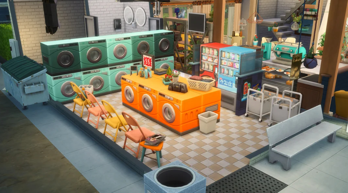 Ещё одна популярная идея, которая давно крутится в свете, — это прачечная, использующая набор The Sims 4 День стирки для создания пространства, где симы могут прийти постирать бельё, взять кофе или перекусить, пока ждут. Большинство прачечных в галерее имеют второе назначение — например, кофейню/библиотеку или йога-студию.