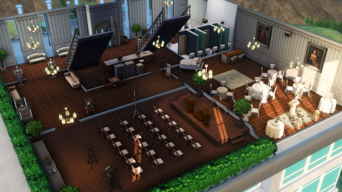 Хотя вы не можете «пожениться» в рамках доступных вам активностей в расписании кастомных участков, вы всё равно можете управлять своим симом на специальной площадке, а это значит, что есть обходной путь для свадьбы. Почему бы не сделать ратушу, где можно устроить свадебную арку для симов, которые не хотят большой, роскошной свадьбы? Даже ваши политические симы могут иногда прийти в офис, выступать с речами и собирать голоса. Коворкинг-офисы для тех, кто активно работает или фрилансеров, также можно создать кофейню в холле для заработанных перерывов, а также спортзал, чтобы сотрудники могли потеть от стресса.