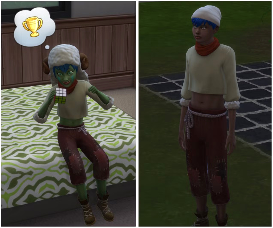 - Маленький разбойник: Азартный (Он дает детям соревновательные развивающие задачи. Он хочет, чтобы его ребенок был лучшим во всем, но у него плохой дух соперничества. Став реальным, он получит черту Азартный, случайную черту и черту «Интерес к мелкой фауне» благодаря жизненной цели «Знаток мелкой фауны».