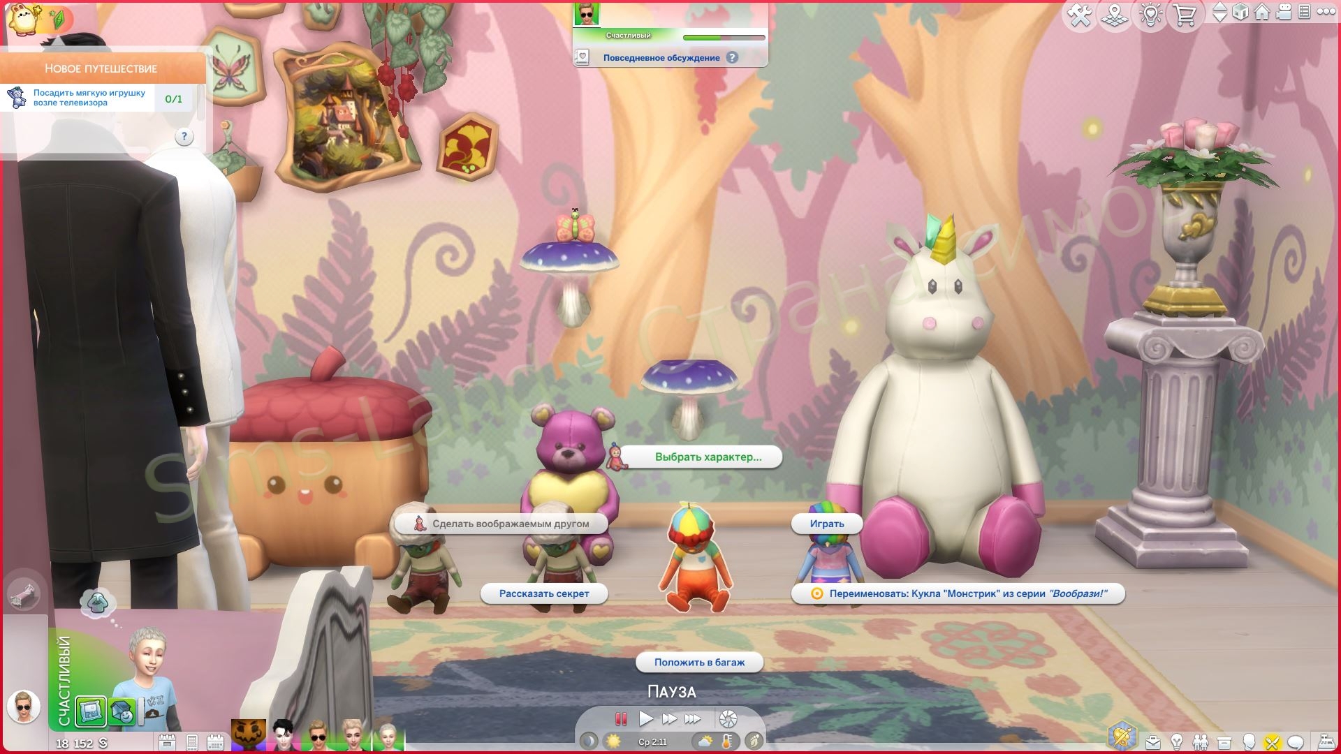 Положительным моментом является то, что даже если вы навсегда попрощались с воображаемым другом вашего сима, он все равно сможет взаимодействовать с куклой и находить в ней утешение в трудные времена. Эта опция может улучшить настроение ваших персонажей во время негативных настроев.