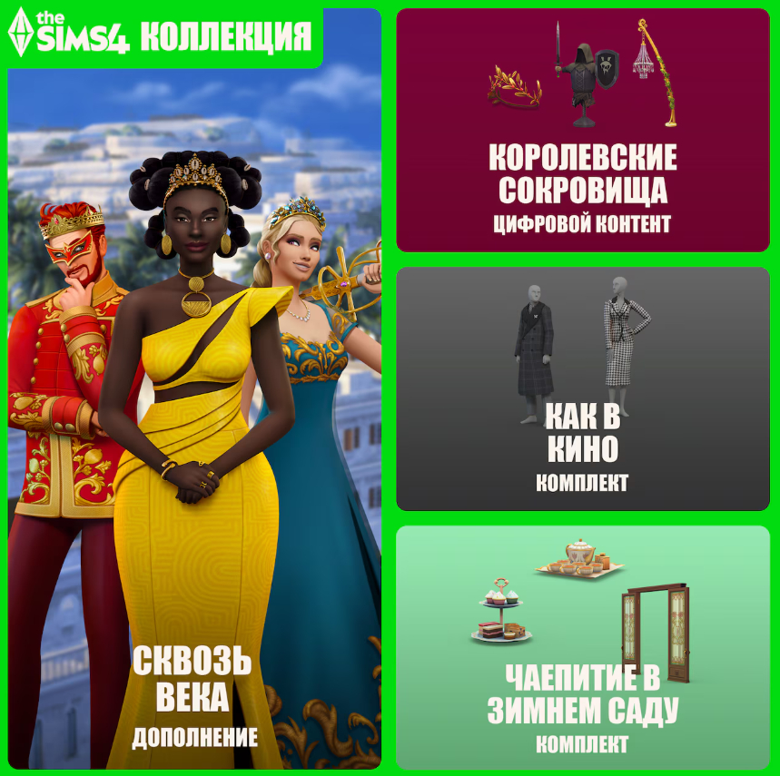 При покупке дополнения «The Sims 4 Сквозь века» вы получите бесплатное улучшение до большой коллекции. В этой коллекции есть все необходимое, чтобы устроить настоящую драму и посплетничать от души. При покупке дополнения «The Sims 4 Сквозь века» с 15 января по 15 марта 2026 года вы получите цифровой контент «Королевские сокровища» и два новых комплекта — «Чаепитие в зимнем саду» и «Как в кино».