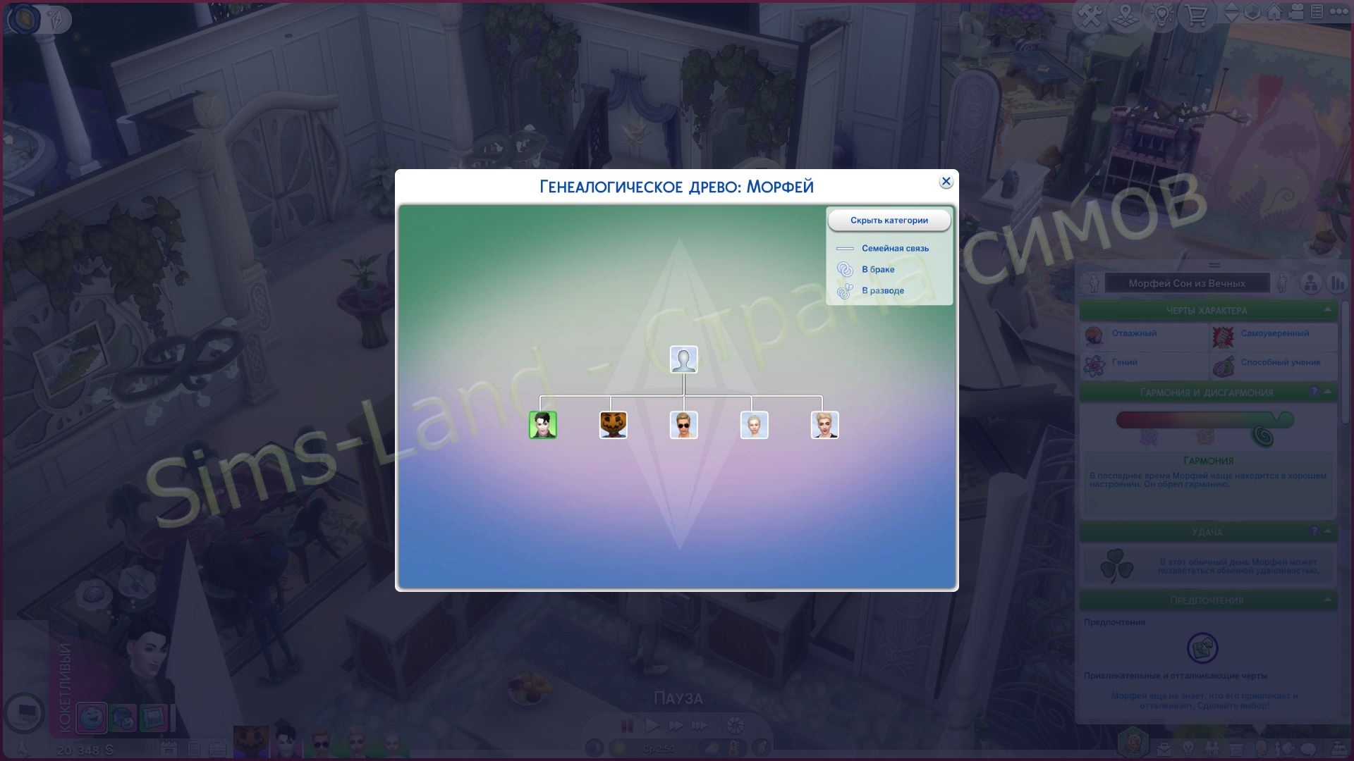 Получите доступ к родословной симов через панель симологии. Генеалогическое древо будет иметь дополнительные функции в дополнении Сквозь века. Здесь вы сможете исследовать историю родословной через гобелен, доску, отточить отношения с помощью пряток или подделки связей и проследить поколенческие истории с помощью семейной книги.
